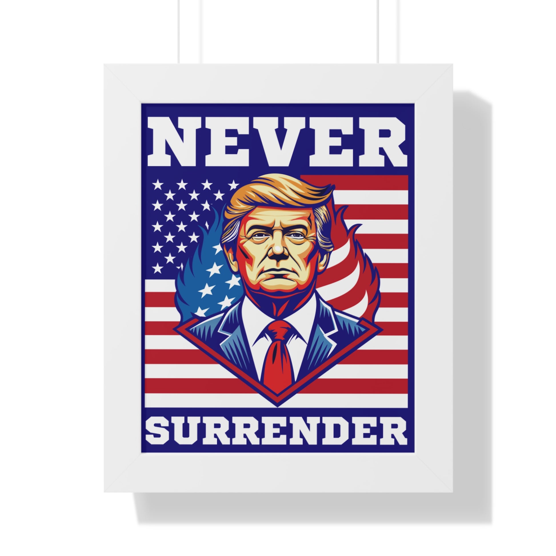 Bold, patriotic, and unapologetic — this framed vertical poster brings a striking graphic presence to any wall. Printed on museum-quality matte paper and protected behind an acrylic cover, the image pops with vivid color and sharp detail while the sturdy frame gives it a clean, finished look. Hang it in a study, office, or den to create an energetic focal point that speaks plainly and loudly about conviction and resolve. The built-in or included hanging hardware makes installation quick, and the archival materials help keep the print looking fresh for years.